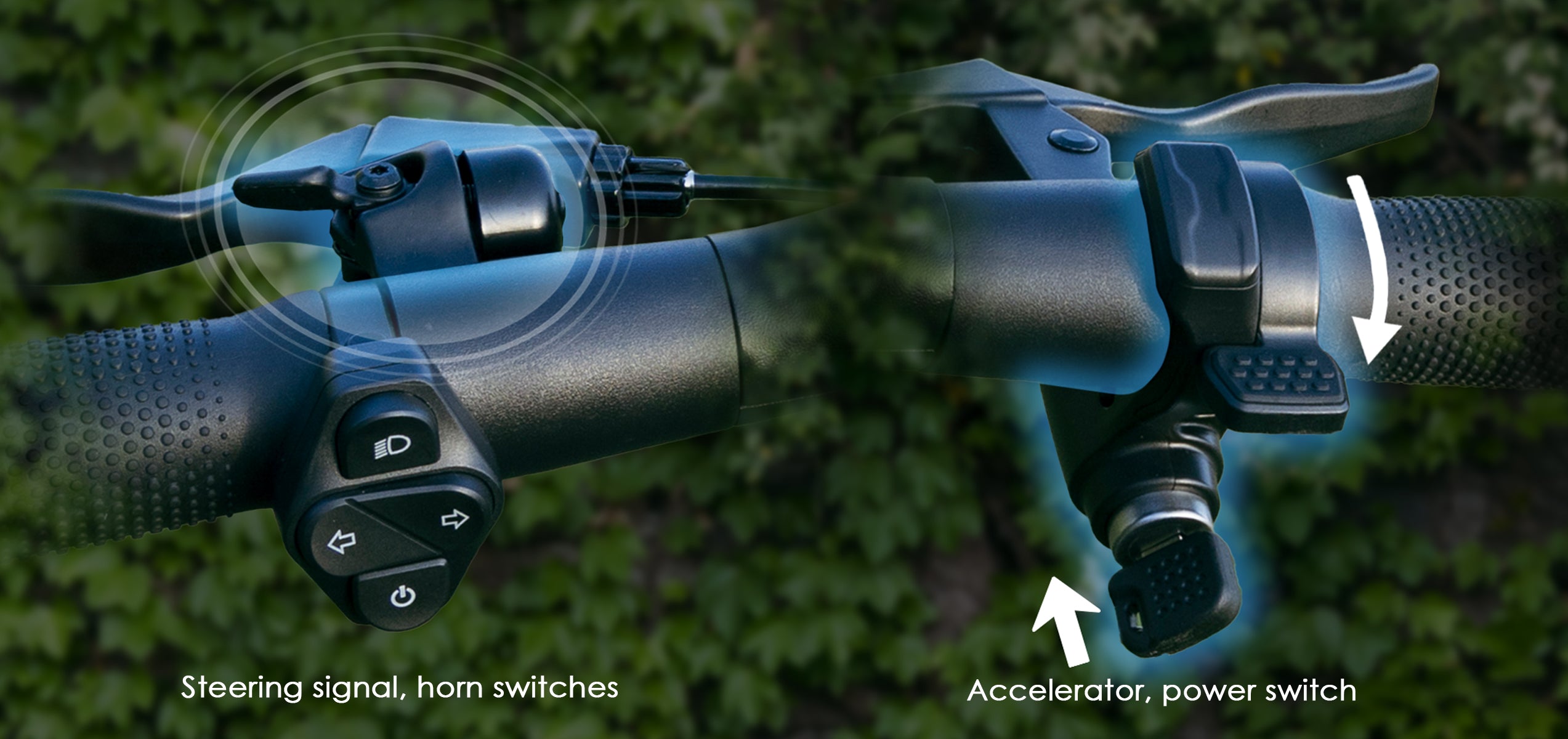E - Accélérateur F - Levier de frein droit G - Pince de pliage