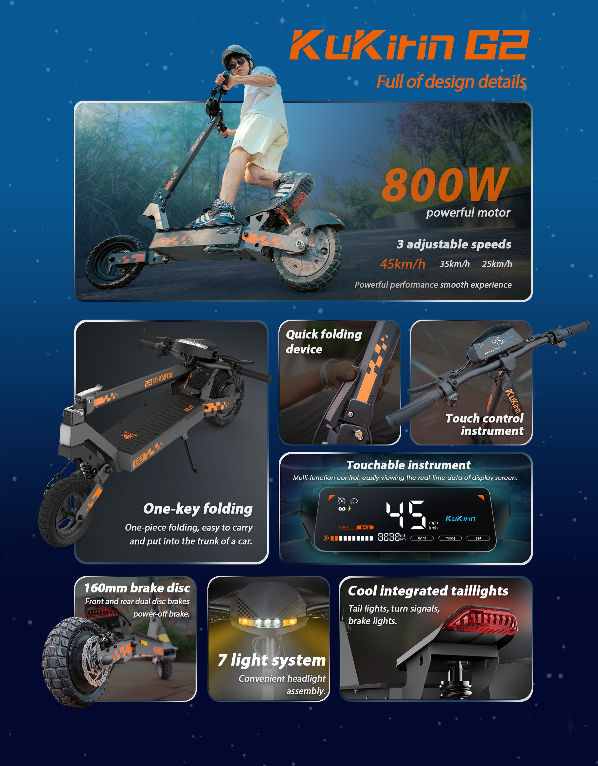 Trottinette électrique KuKirin G2 — moteur 800W, vitesse 45 km/h, autonomie 55 km. Idéale pour les trajets quotidiens.