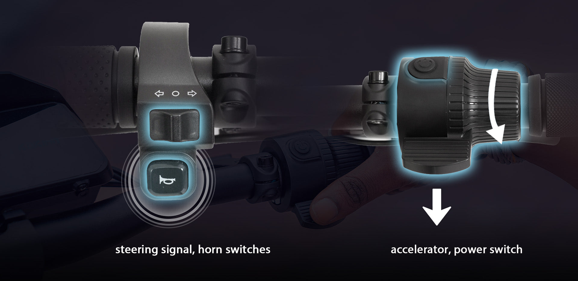 Clignotants et klaxon à gauche, accélérateur et interrupteur à droite. Tout à portée de main.