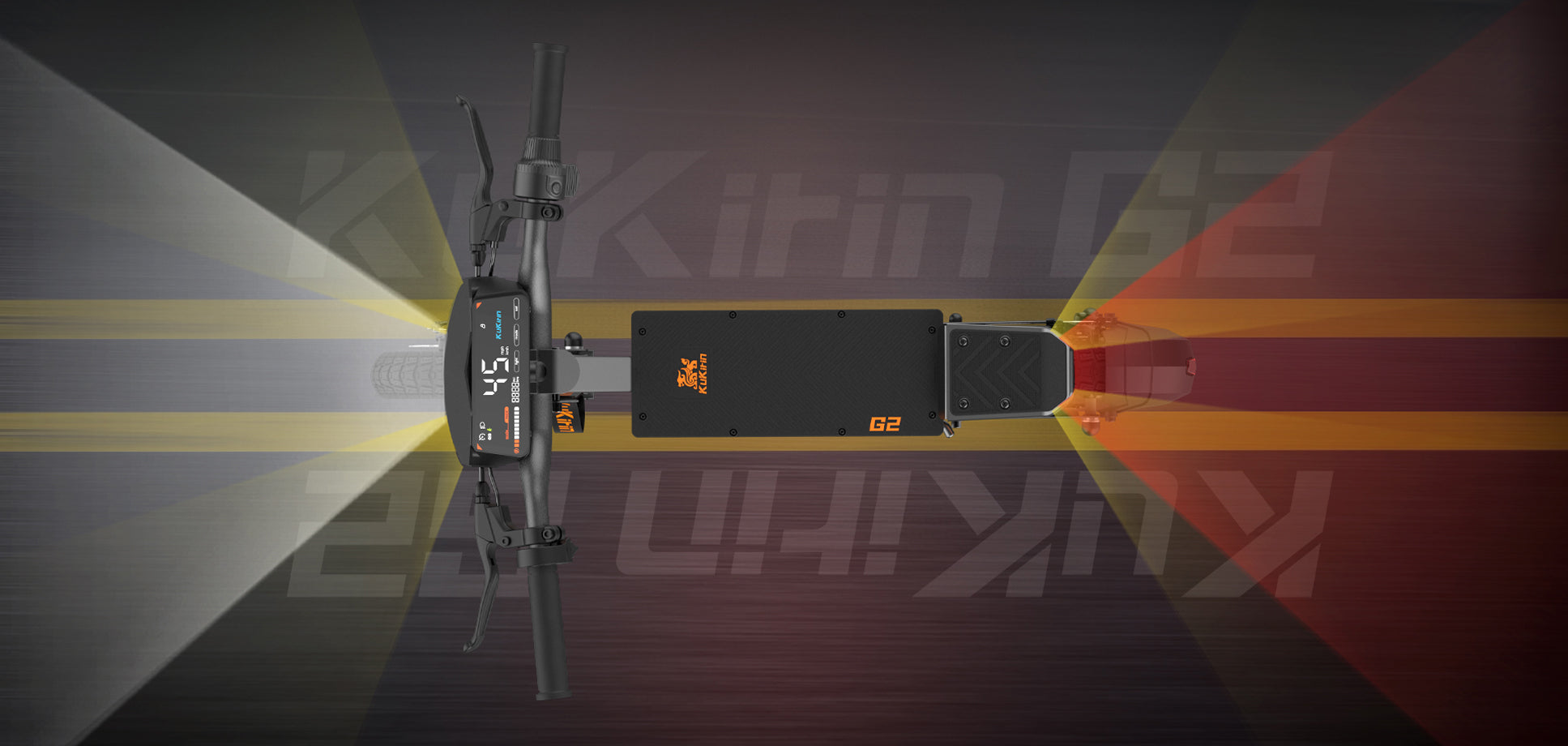 Système d'éclairage complet : phare avant, clignotants et feu arrière pour une visibilité totale.