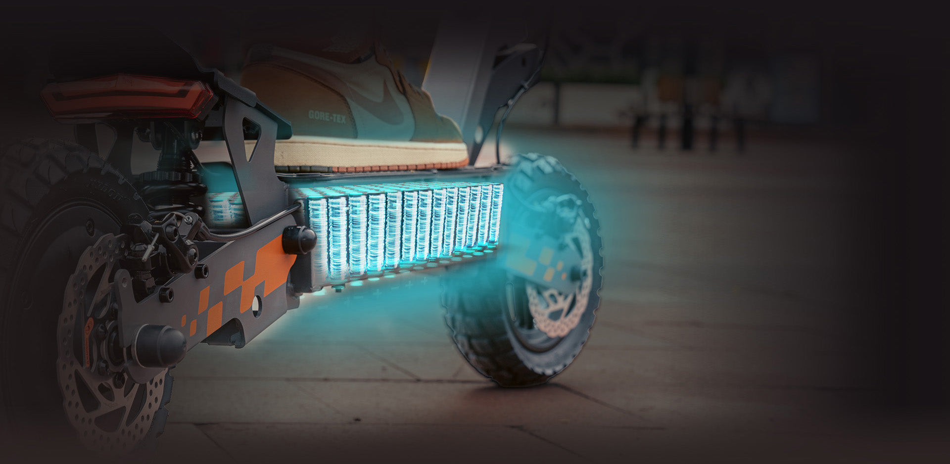 Cellules lithium haute capacité intégrées dans le châssis pour 55 km d'autonomie.