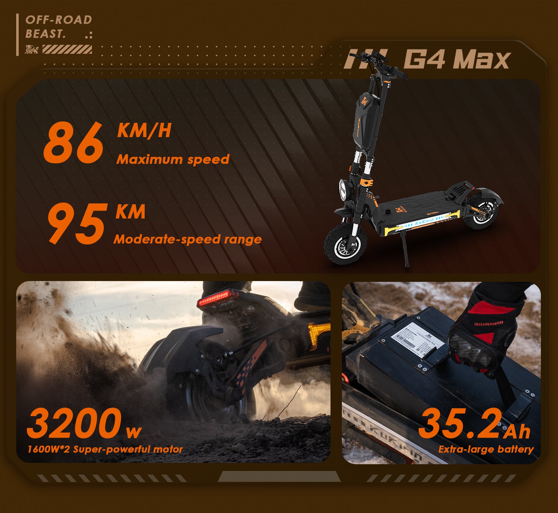 Trottinette électrique KuKirin G4 Max — double moteur 2x1600W, vitesse 86 km/h, autonomie 95 km. Le plus puissant de la gamme.