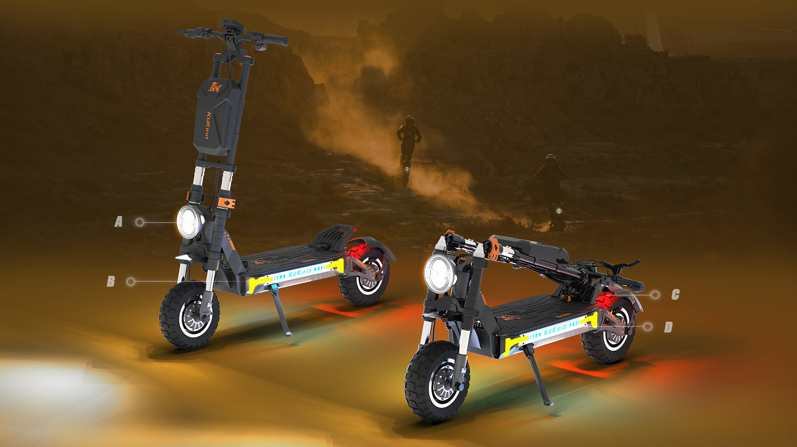 A - Tige de pliage double B - Phare avant C - Amortisseur hydraulique D - Pneu tout-terrain