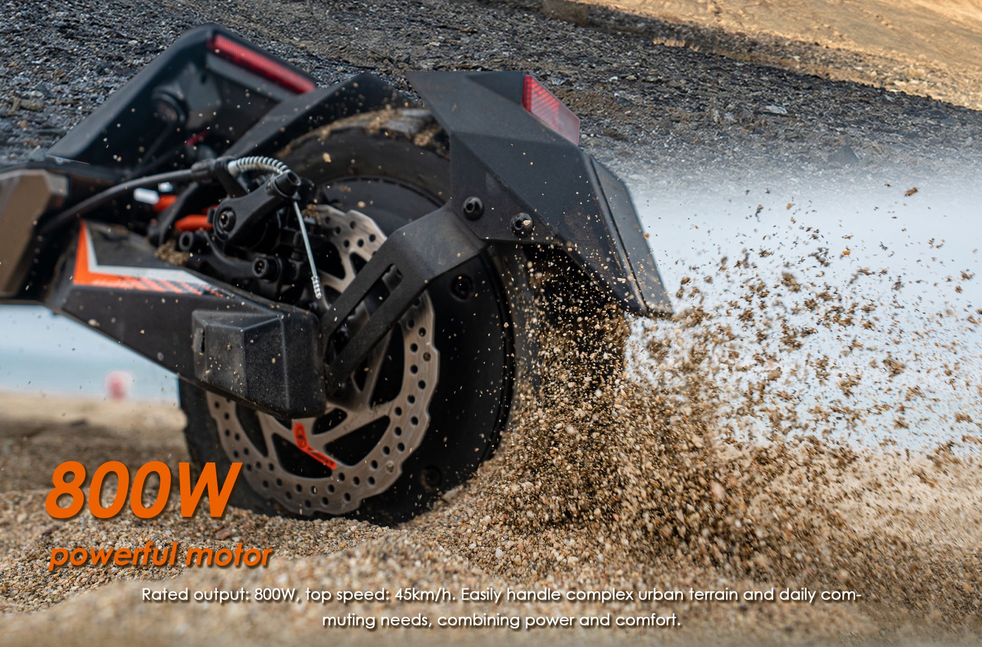 Moteur brushless de 800W pour une vitesse max de 45 km/h. Puissance et fiabilité pour les terrains urbains et les pentes jusqu'à 20°.
