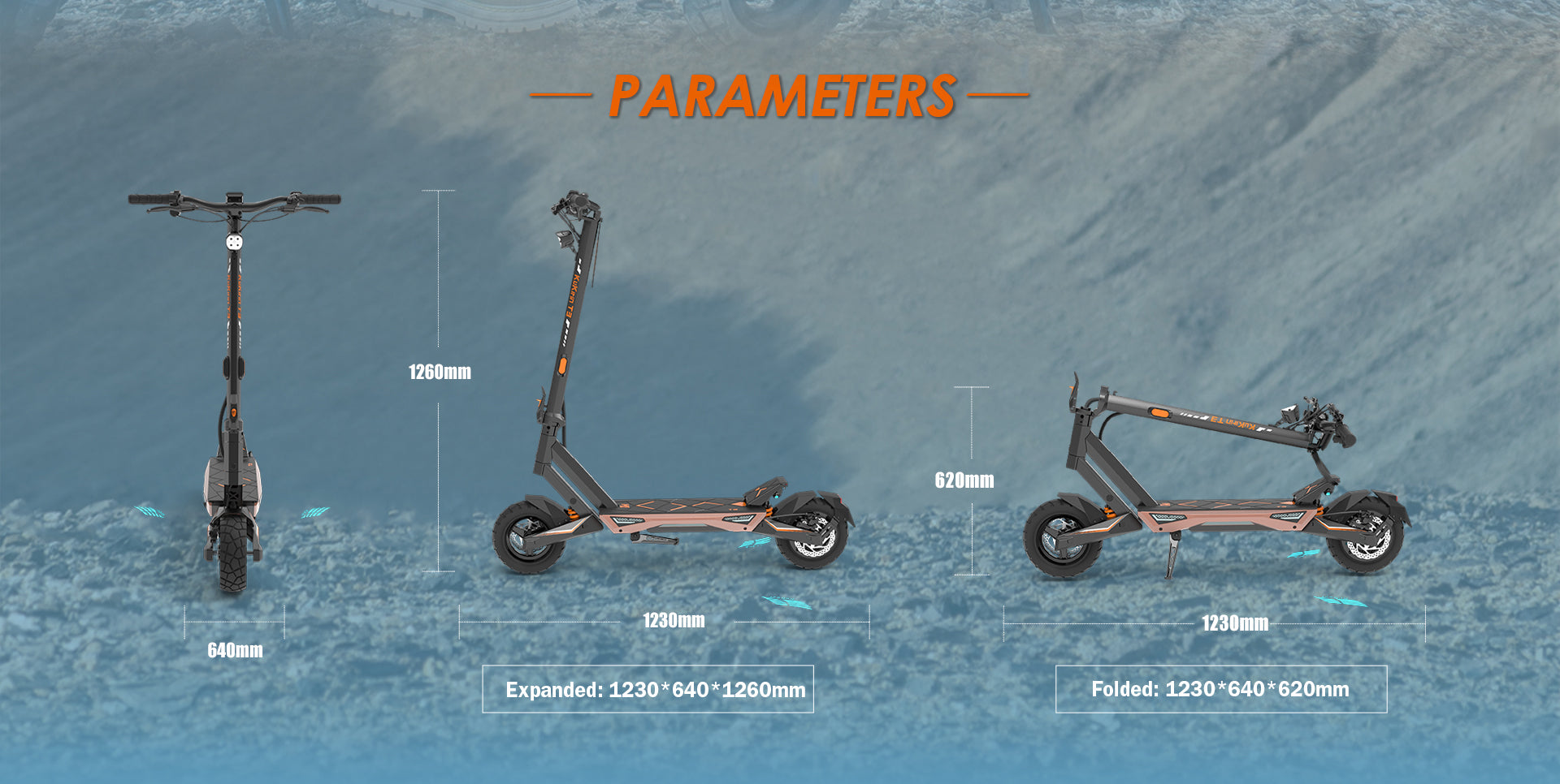 Vitesse max 45 km/h. Design géométrique à facettes diamant. Lasers Angel Wings. Pneus tout-terrain 10 pouces.